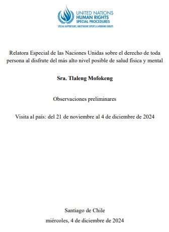 La misión de la relatora fue enterarse de la situación de salud mental en nuestro país en diferentes regiones, y se reunió con organizaciones e instituciones para realizar un “Informe Preliminar” que entregó el 4 de Diciembre, 2024 de acuerdo a los objetivos de su mandato, y posteriormente efectuar un Informe Final en Junio de 2025.