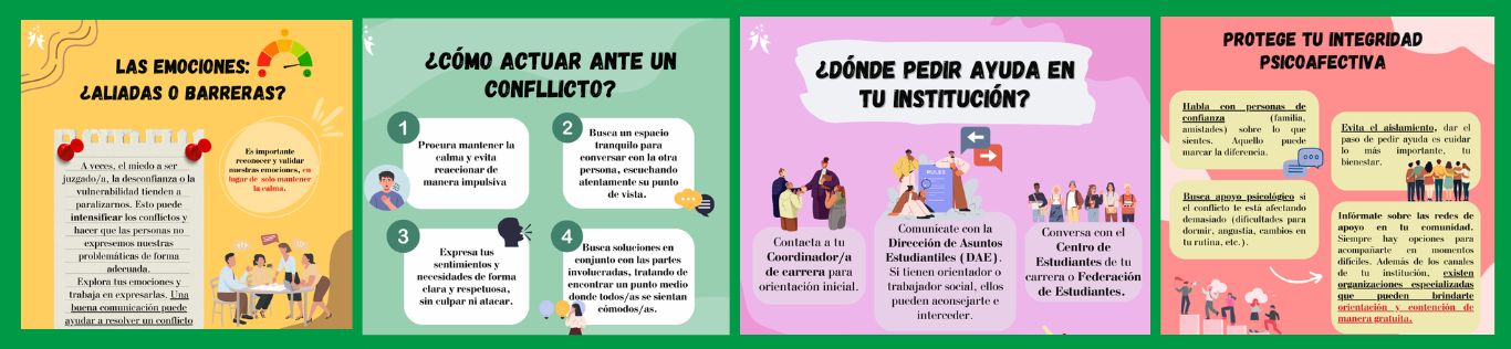 Estos pueden surgir en distintos contextos: desde desacuerdos con compañeros en trabajos grupales hasta tensiones derivadas por asimetrías de poder con docentes o autoridades. A ello se suman factores personales o externos, como el estrés académico o situaciones emocionales, que pueden intensificar las dificultades, y afectar tanto el desempeño o rendimiento, como el bienestar emocional del estudiante.