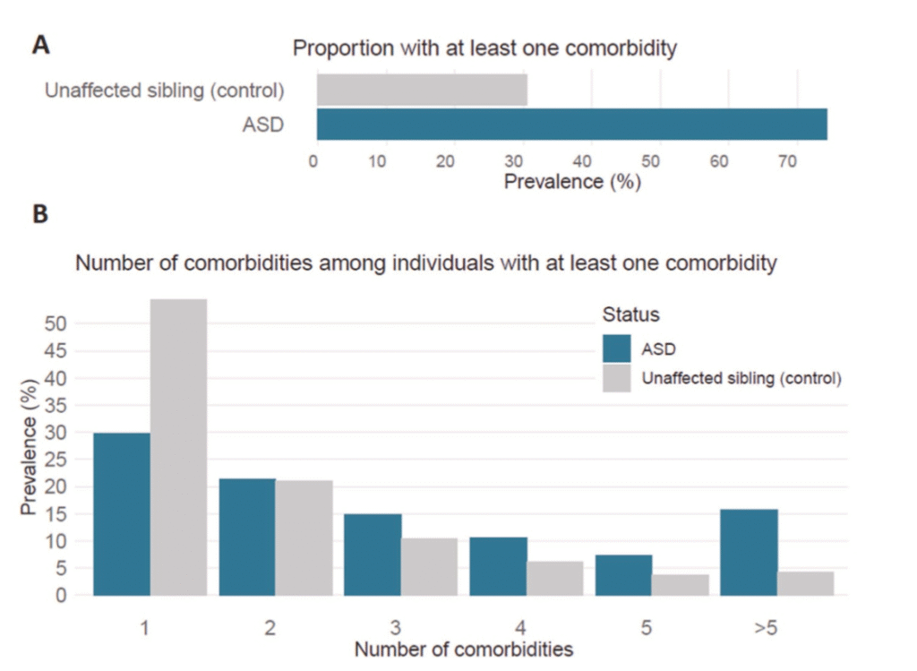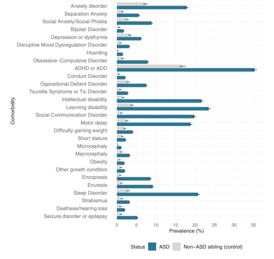 El gráfico anterior muestra los resultados de un estudio que comparó a niños con autismo y a sus hermanos no autistas de acuerdo con la frecuencia de aparición de coocurrencias. La longitud de las barras muestra la prevalencia en porcentaje de distintas coocurrencias en niños autistas (barras azules) y sus hermanos no autistas (barras grises). Como se observa, en todas las coocurrencias analizadas los niños autistas las presentan en mayor porcentaje, siendo especialmente frecuentes el TDAH (Trastorno por déficit atencional e hiperactividad), la discapacidad intelectual, los problemas de aprendizaje, desórdenes del sueño, trastornos de ansiedad, entre otros, lo que enfatiza la necesidad de detectar estas condiciones precozmente. 2