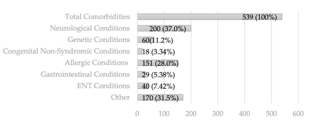 En este otro estudio podemos ver en el gráfico de barras que, de todas las coocurrencias, las de origen neurológico son las más frecuentes. Esto hace muy relevante, especialmente en niños, el rol del neuropediatra que evalúa al menor, ya que el rol del especialista no solo es recibir un informe de una prueba como ADOS-2 o el de una evaluación multidisciplinaria y confirmar oficialmente el diagnóstico, sino que debe descartar la presencia de coocurrencias y determinar la necesidad de solicitar otras pruebas diagnósticas de ser necesario.3