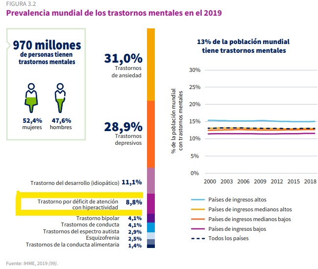 Es importante considerar en contexto que un 8,8% de la población mundial tiene TDAH entre las prevalencias de trastornos de salud mental, de acuerdo al World Mental Health Report: Transforming mental health for all, publicado por la Organización Mundial de la Salud (OMS) en junio de 2022, pág 66.